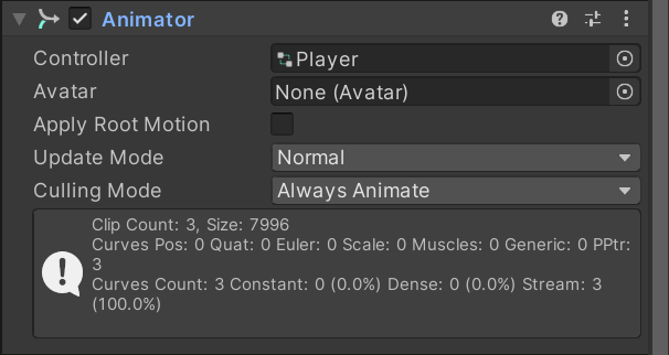 首先我们先创建一个 Animator 命名为Player,并将其添加到 Player 上。