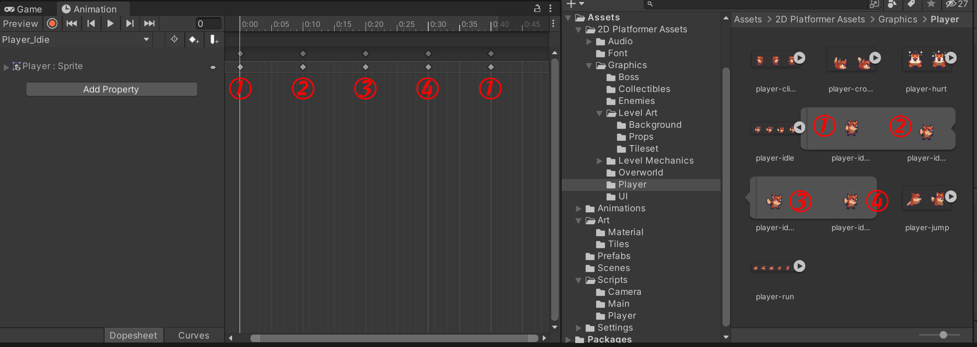 本次我们主要制作三个动画,分别是 Player_Idle,Player_Run,Player_Jump ,即空闲,跑步,跳跃这三个动画。