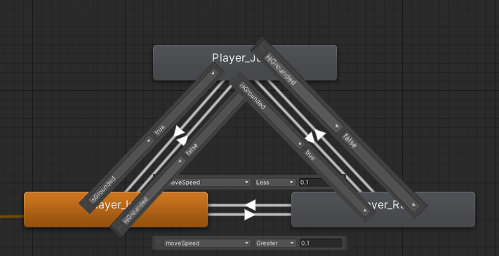 1 2 3 4 5 6 7 8 9 10 11 12 13 14 15 16 17 18 19 20 21 22 23 private Animator anim;private static readonly int IsGrounded=Animator.StringToHash("isGrounded" );private static readonly int MoveSpeed = Animator.StringToHash("moveSpeed" );void Start (){ anim = GetComponent<Animator>(); } void Update () { anim.SetBool(IsGrounded,isGrounded); anim.SetFloat(MoveSpeed,Mathf.Abs(rBody.velocity.x)); }