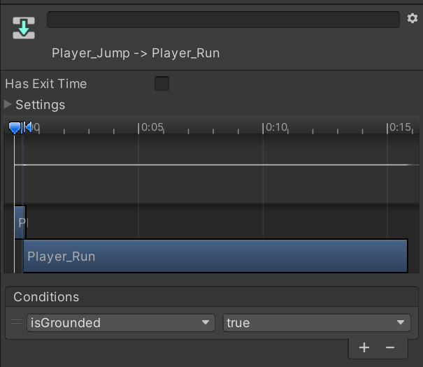 将每个动画的 Has Exit Time 关掉,并且在 Settings 里将 Transition Duration 设置为0,使动画之间可以直接切换。